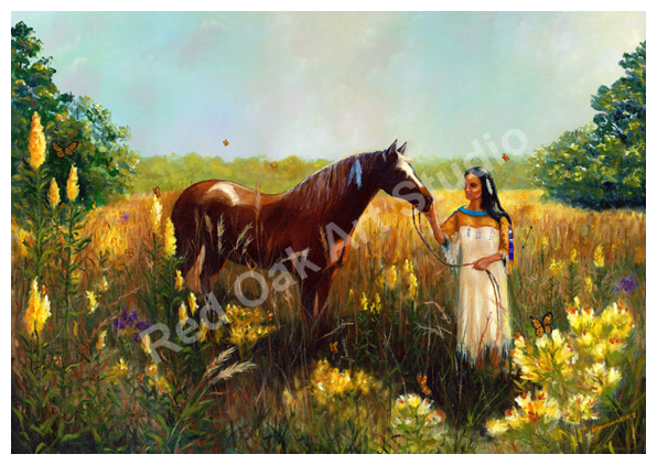 Original oil sized 40″ X 28″, rich golden colors of fall can bring sunshine to any room. History of original prairies of Missouri and authentic style Indian dress. Framed in brown 4 inch wide wooden frame.