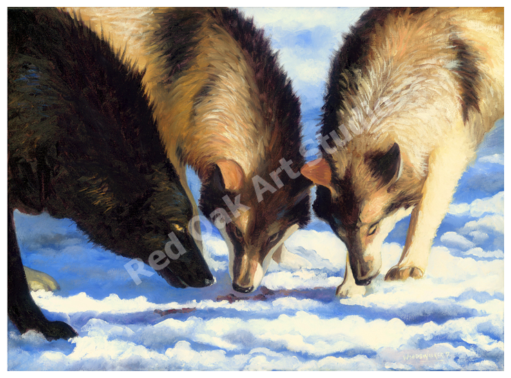 This is a spell binding oil of the wolves of Eli Minnisota. Although these particular wolves are no longer with us, it shows the stark reality of the social status of the Alpha male or female. Beautiful highlights of the northern snows with sharp contrasts of the wolves, this painting is captivating surrounded in a 2" white linen liner and a 3" wide warm oak frame.