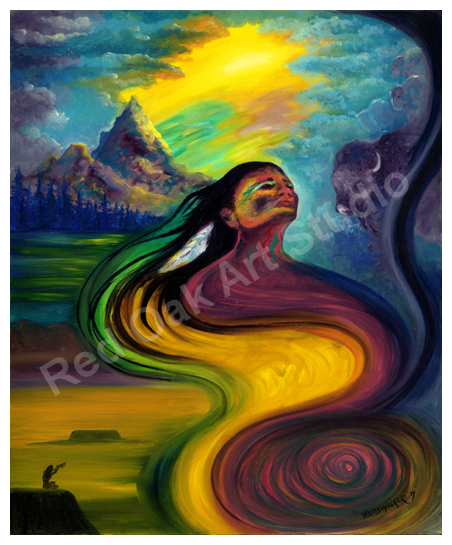 Painting is called "5 hidden Spirit Animals" Horse, turtle, wolf, bear, and eagle. Scene was from river near Cherokee N.C.