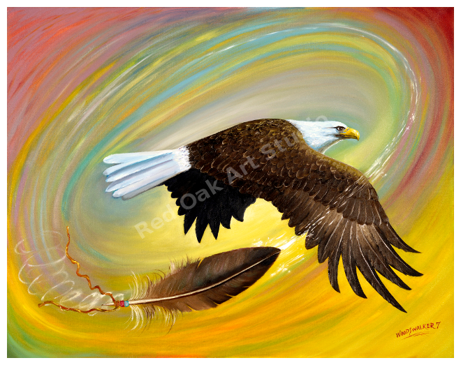 "Feather Medicine" Framed in Tobacco leaf covered frame with 2" white linen liner. Native Americans of old used feathers in their medicine practices to heal and understand what is going on in the body and soul of a persons makeup. I ave personally experienced the power of the eagle feather during healing sessions as I too practice this age old method of healing. It was a privilege and honor to paint this depiction of the art of "Feather Medicine."