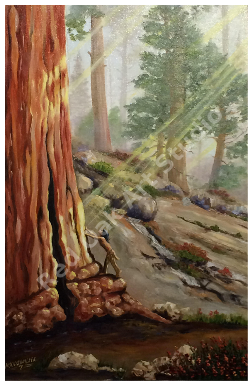 "Sequoia Giant" Framed in a tobacco leaf covered frame with 2" white linen liner. Description: The Sequoia Giant trees, the largest trees on the planet, only grow in the U.S, in California, and Russia. Largest tree in the world at 36 1/2' in diameter. They grow only at an elevation of 5,000 to 7,000 feet above sea level. This is a depiction of a curious little Indian boy in utter admiration of the giant trees, a place he calls home.