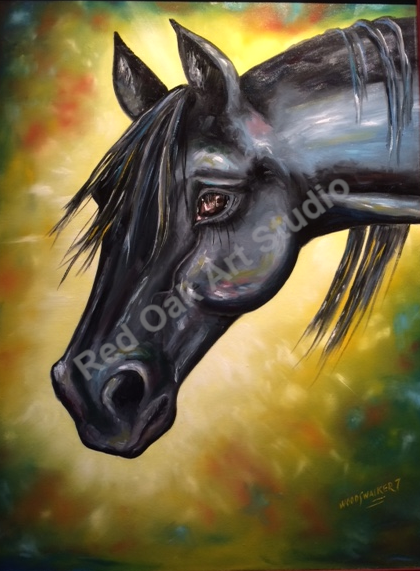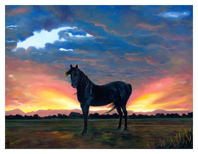 Latest painting entitled "Night Freedom" is a wrap around canvas sized at 25"x19", with a 1 1/2 inch wide wrap around frame. The scene depicts a magnificent, black as the night, horse set against an incredible Colorado sunset.