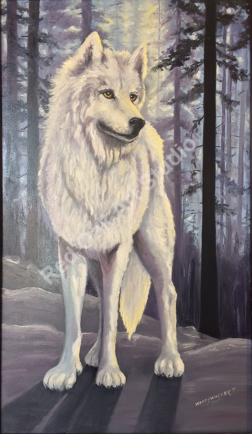 "Spirit Wolf" Painting is 18"x32" inches. Framed in a rich 4" wide dark wood frame. Price $800.00. Painting done in appreciation of white wolf I seen at Yellow Stone National Park.