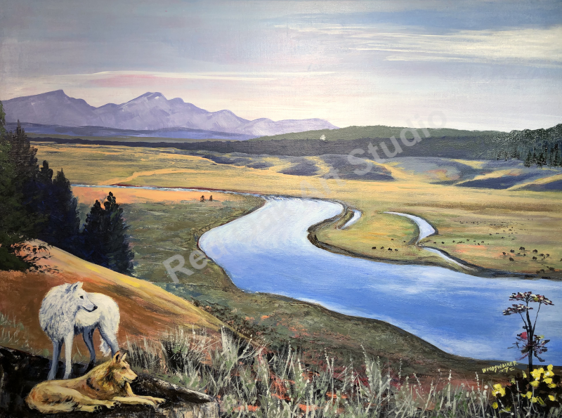 This scene taken from photo this past Summer at Yellowstone with white wolf in memory of seeing her up close and personal at Yellowstone 5 years ago.